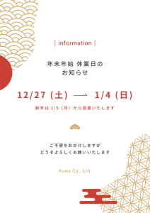 年内の最終営業日は12月26日(金)17時までとなります。